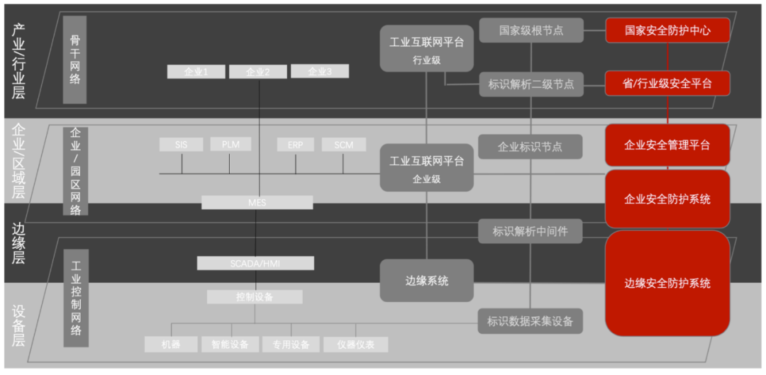 安全实施围绕工业互联网的“四层三网两平台一系统”提出从五个层面进行建设实施:边缘安全防护系统、企业安全防护系统、企业安全管理平台、省级/行业级安全平台和国家安全防护中心。
