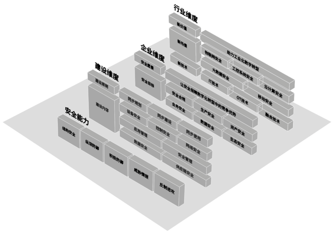 安全业务视角从五个维度来分别阐述。安全业务视图从产业、企业、建设和能力四个维度分别阐述业务目标和要求。